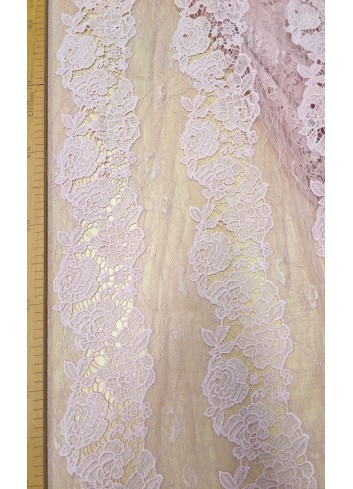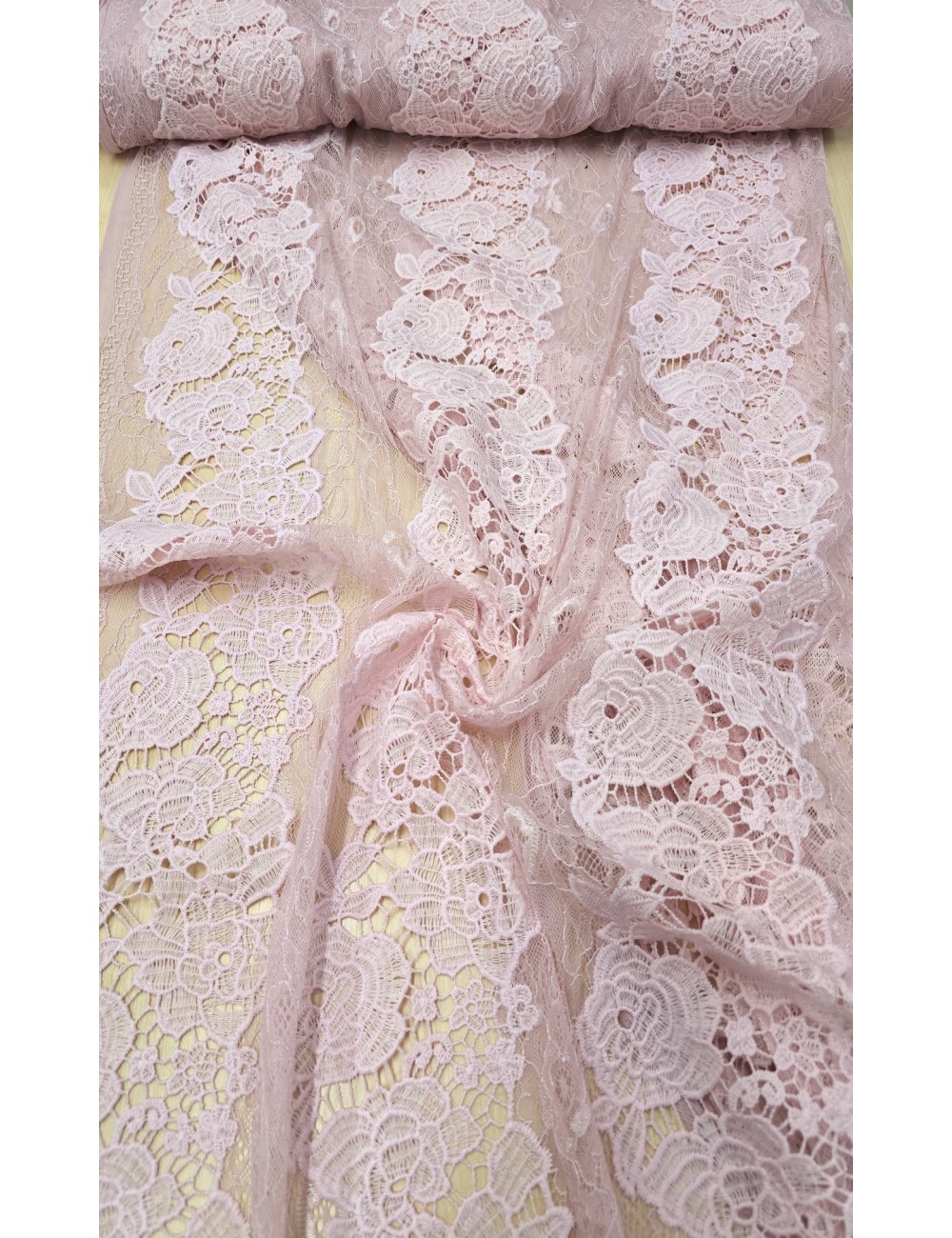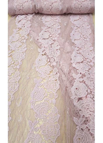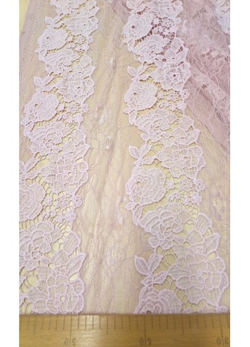 Nádherná a neobvyklá kombinace dvou typů krajek a to jemné peříčkové a efektní plastické macramé v romantické růžové barvě. Mírně elastická, velice příjemná na dotek, splývavá.
