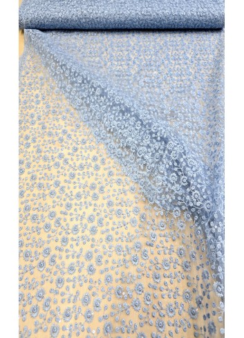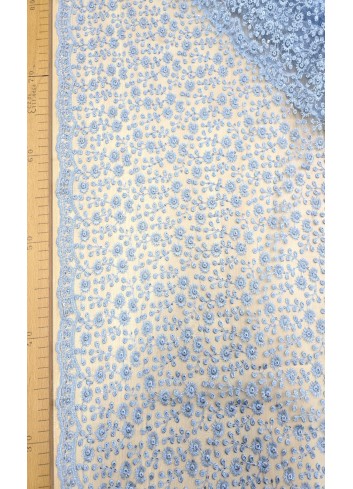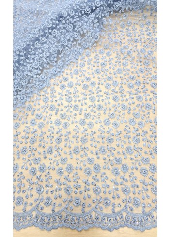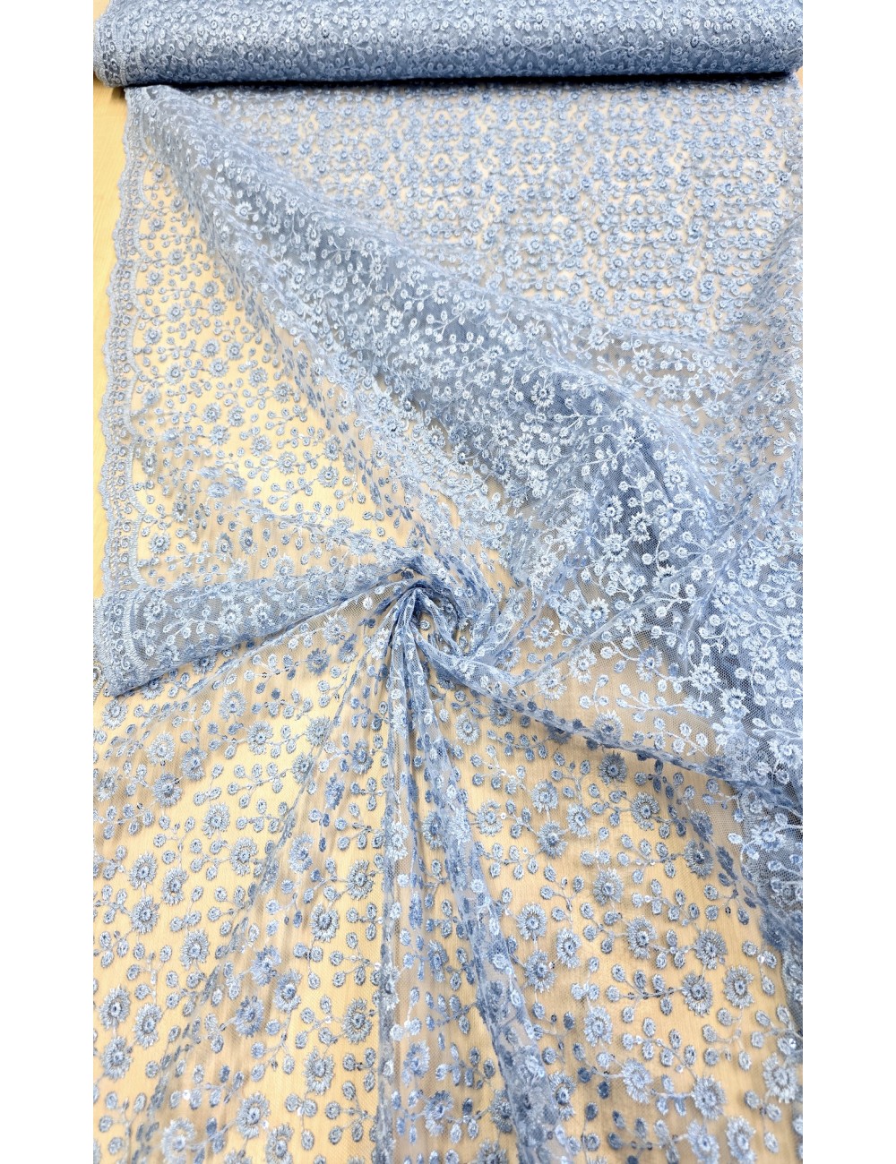 Portugalská blankytně modrá krajka s vyšívanými drobnými kvítečky, zdobená decentně pajetkami. Romantická krajka, mírně elastická vazbou, krásně vyšívané okraje do obloučků.