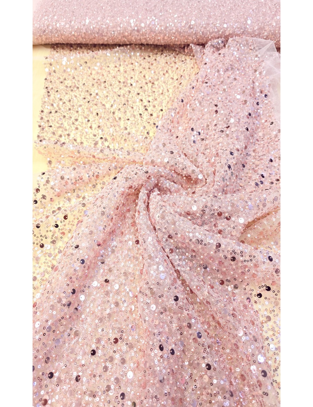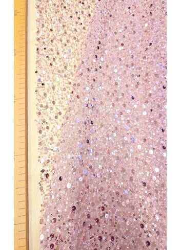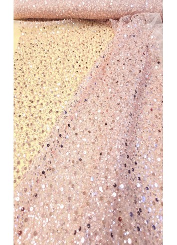 Elegantní portugalská krajka v růžové barvě bohatě vyšívaná flitry, kamínky a drobnými perlami, krajka vypadá velice elegantně a luxusně. Velice dobrý poměr kvality a ceny.