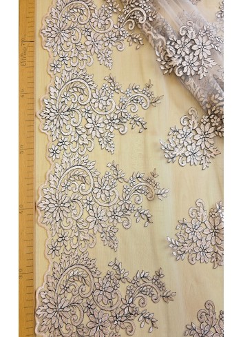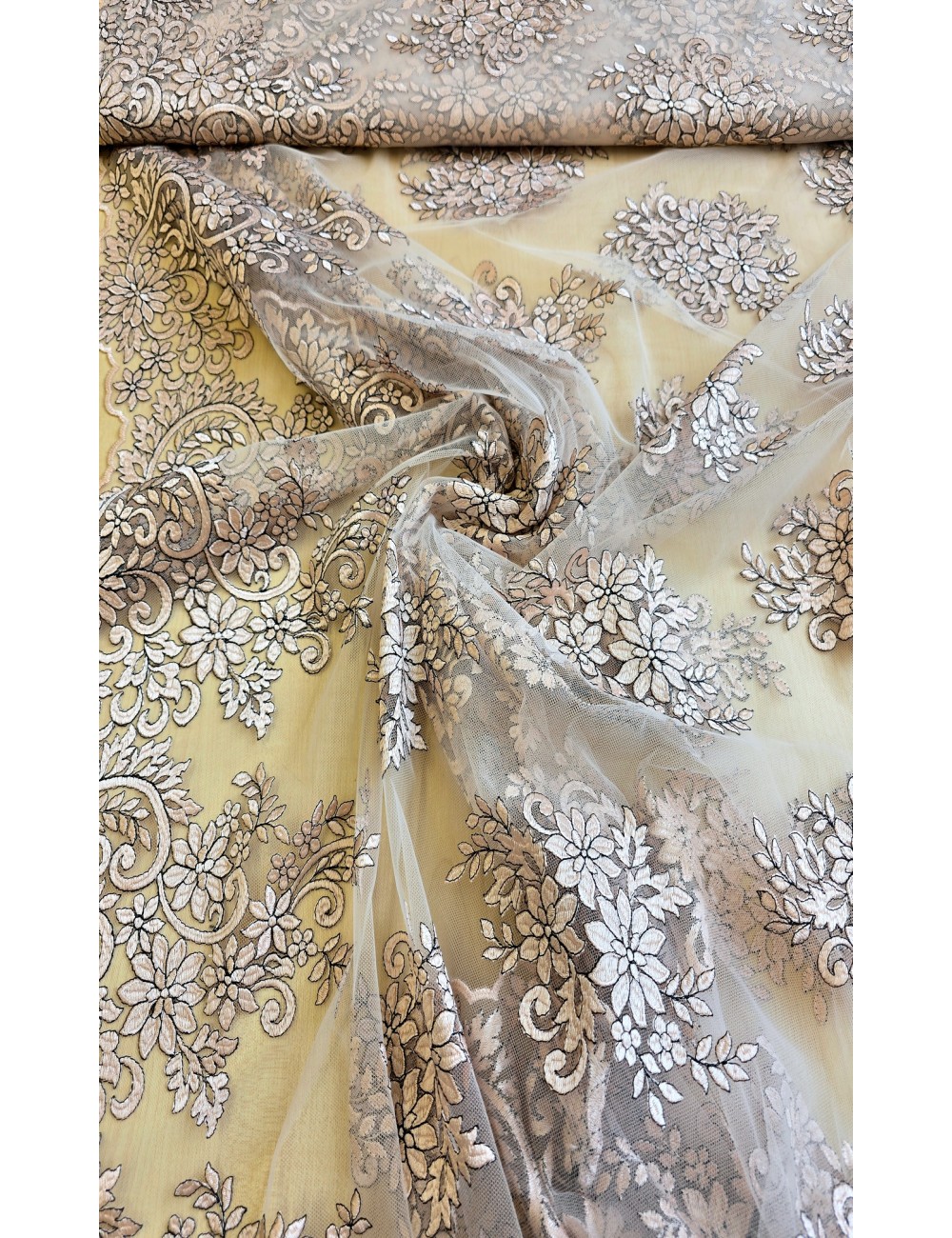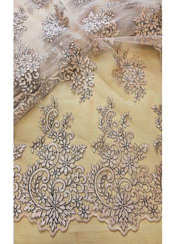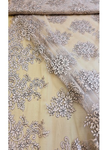 Luxusní italská krajka ve světle béžové barvě s elegantním květinovým vzorem a zdobnými obloučkovými okraji. Velice efektní krajka, příjemná na nošení, mírně elastická.