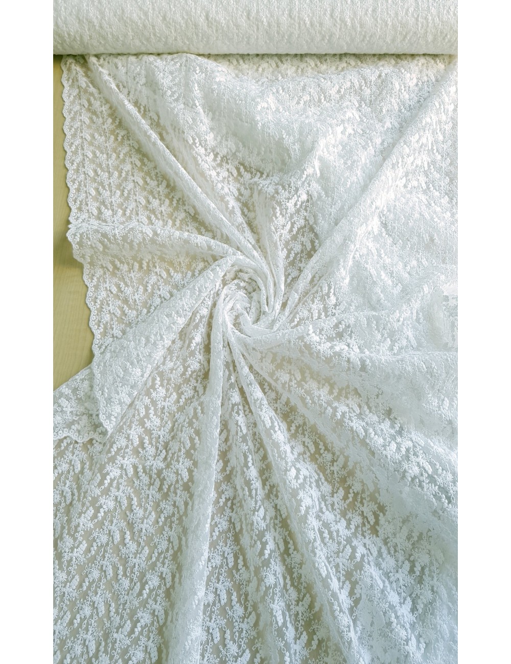 Lehoučká a jemná portugalská krajka v bílém provedení s krásným droboučkým květinovým vzorem, jako dělaná pro romantičky, vhodná i na šaty ve stylu boho, velice příjemná na dotek.