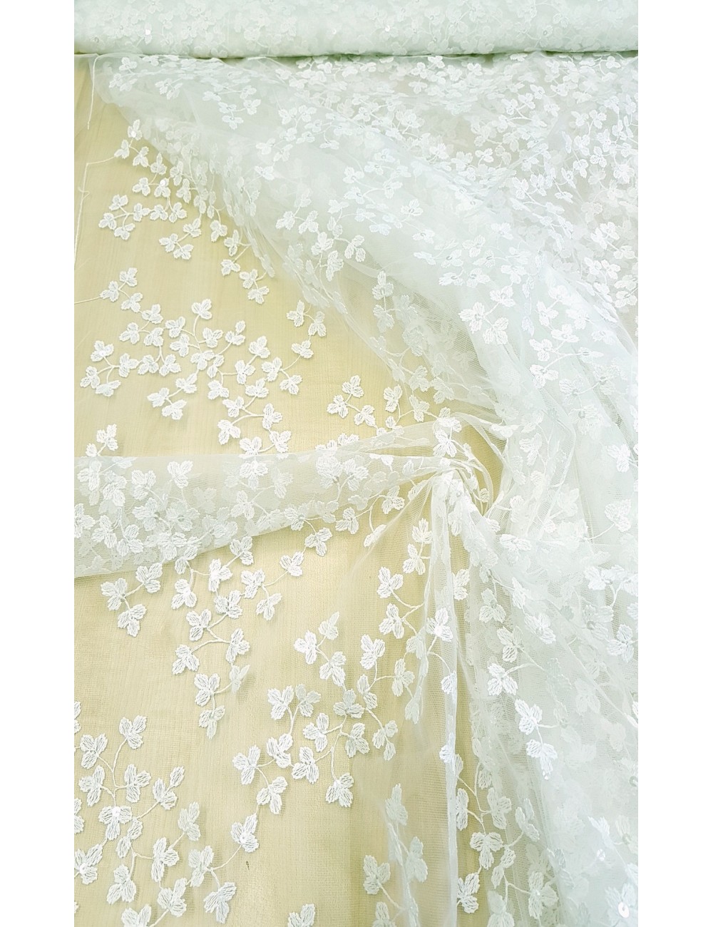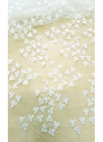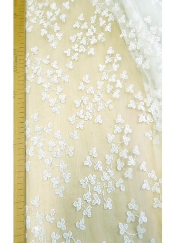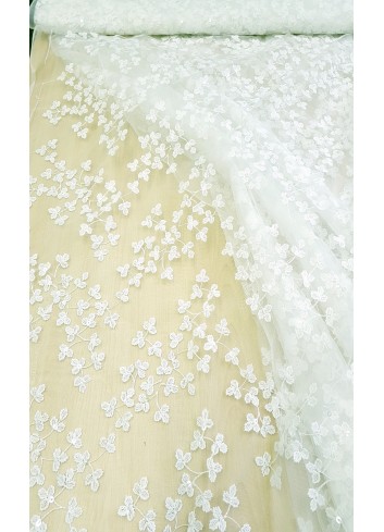 Luxusní portugalská svatební krajka v ivory barvě, vyšívaná celoplošně drobnými romantickými lístky, zdobena decentně průsvitnými pajetkami, velký podíl přírodního materiálu způsobuje, že je příjemná na dotek. Velice efektní svatební krajka, splývavá a mírně elastická. Super šíře 3m! Made in Portugal.