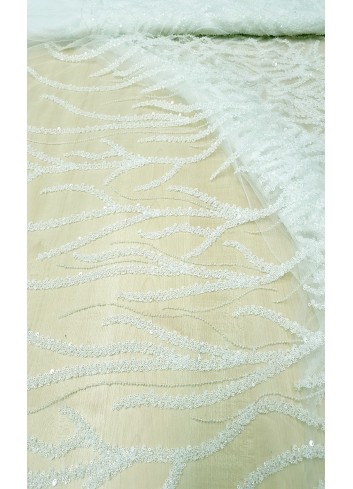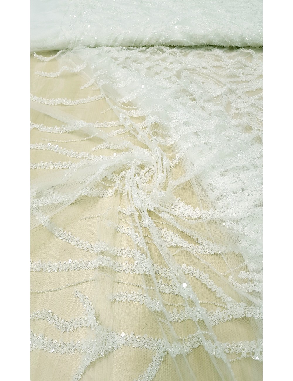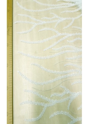 Luxusní portugalská 3D svatební krajka v barvě ivory, vyšívaná vlnitým geometrickým vzorem různými typy a velikostmi flitříků a drobnými perličkami, příjemná na dotek. Velice efektní svatební krajka. Vyrobeno v Portugalsku.
