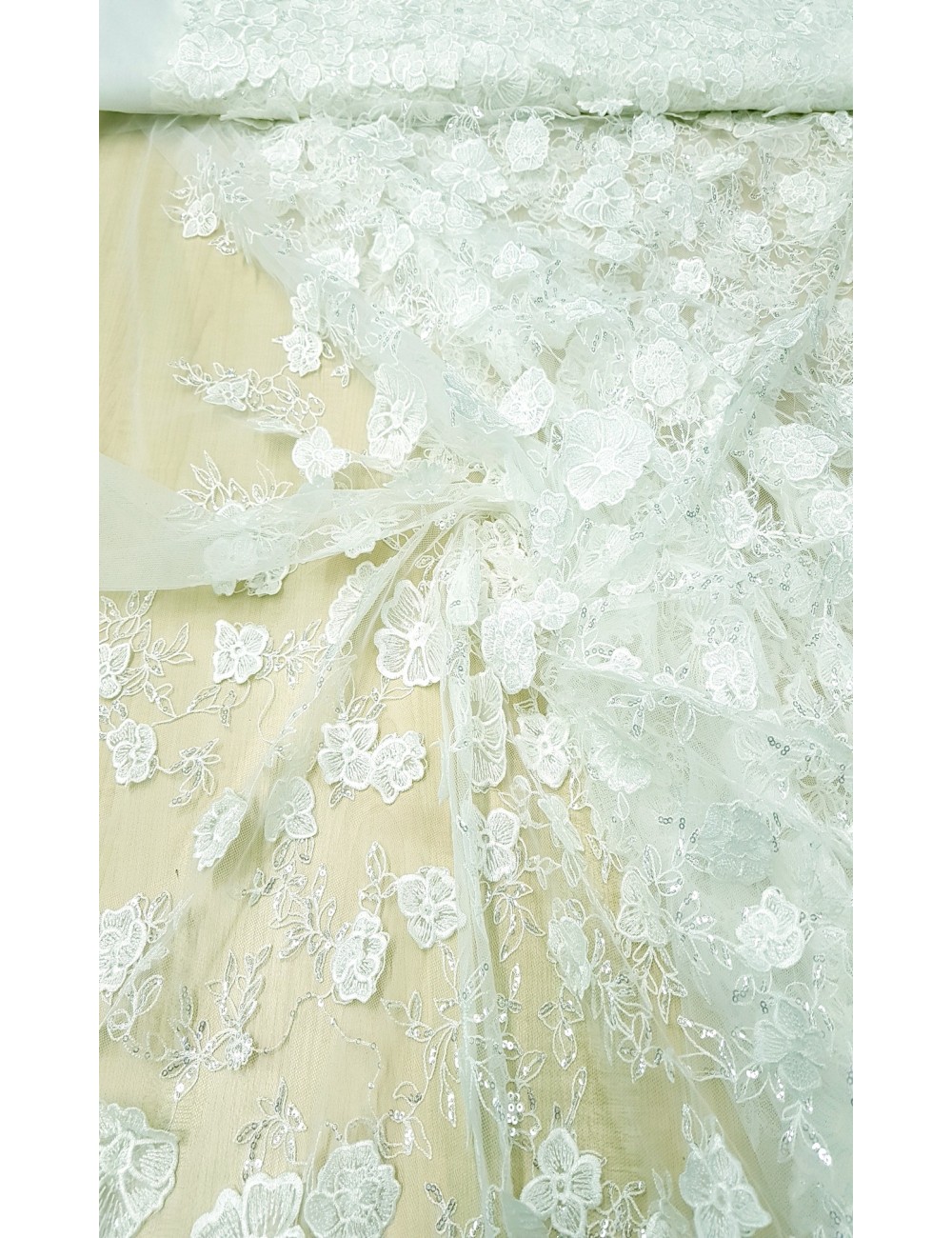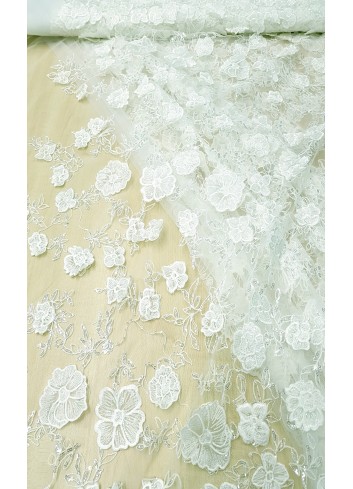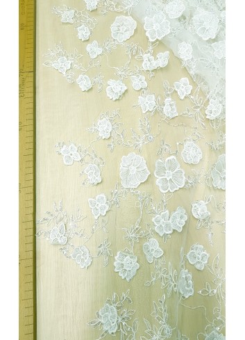 Luxusní portugalská svatební krajka v barvě ivory, vyšívaná květinovým 3D vzorem na velice jemném tylu a zdobena decentně průhlednými flitříky, příjemná na dotek. Velice efektní, luxusní a jemná svatební krajka. Vyrobeno v Portugalsku.