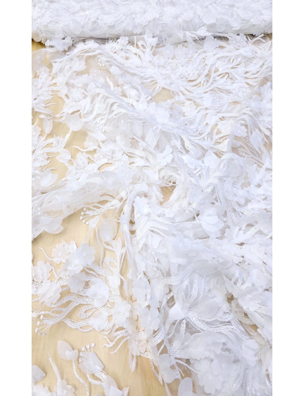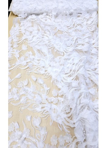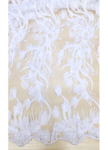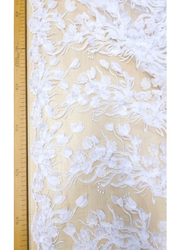 Naprosto luxusní italská krajka v bílé barvě a krásným vyšívaným 3D květinovým vzorem, zdobena bílými drobnými flitry a vyšívanými obloučkovými okraji. Velice dekorativní a efektní krajka, vyrobeno v Itálii, kvalitní zpracování.