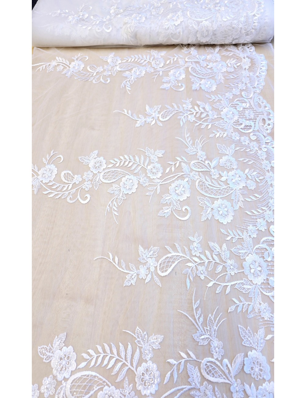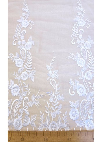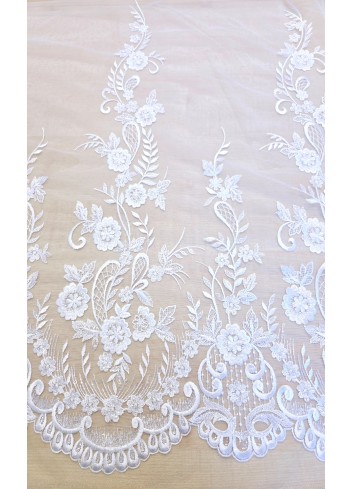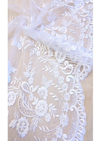 Luxusní portugalská krajka v bílé barvě s jednostrannou bordurou o šíři 70 cm a vyšívanými obloučkovými okraji. Velice dekorativní a efektní krajka, vyrobeno v Itálii, kvalitní zpracování.