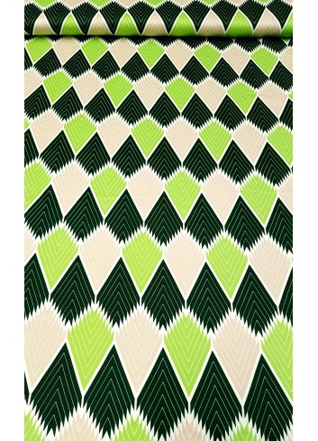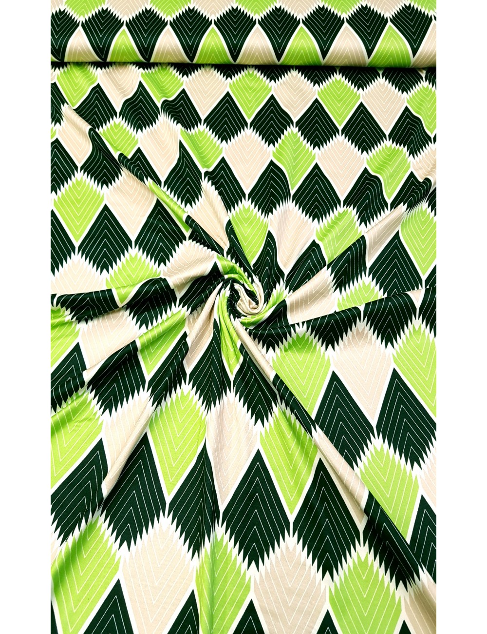 Úplet super jersey s barevným geometrickým vzorem je střední gramáže, měkký s větším obsahem lycry, perfektně elastický. Nekrčí se, dobře drží tvar, snadno se udržuje a hezky tvaruje postavu.
