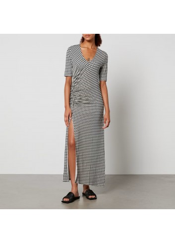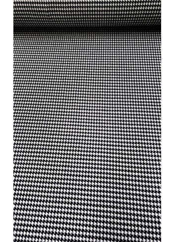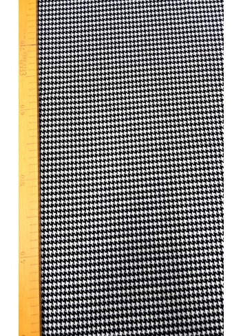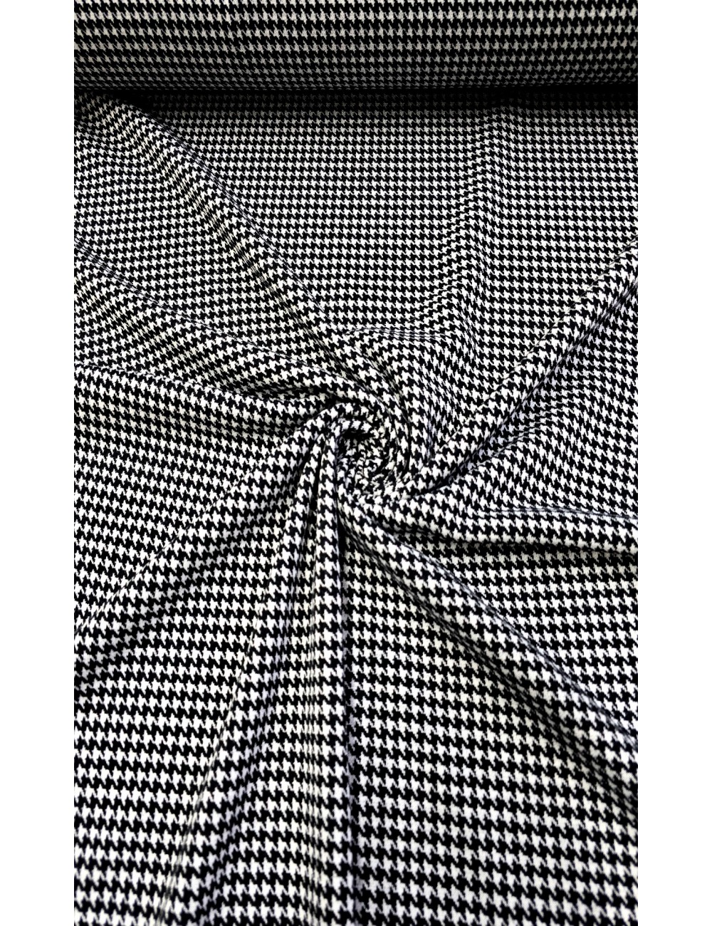 Italský úplet s nadčasovým černobílým drobným vzorem kohoutí stopy, střední gramáže. Střední gramáže, příjemný a pohodlný na nošení, elastický, nekrčivý.