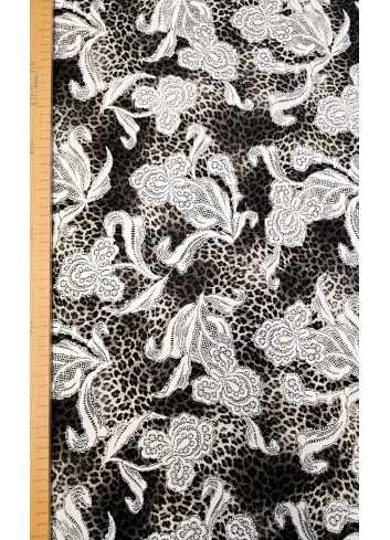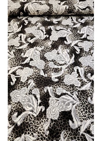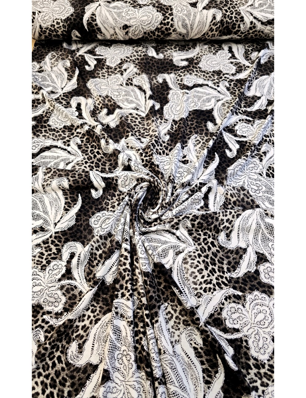 Středně silný viskózový úplet s animal a květinovým vzorem v tmavě hnědých odstínech na iory základu, příjemný a hladký na dotek, vynikající kvalita, elastický. Vyrobeno v Itálii.