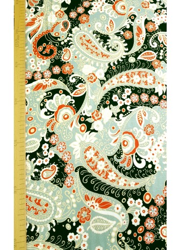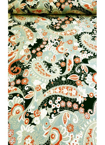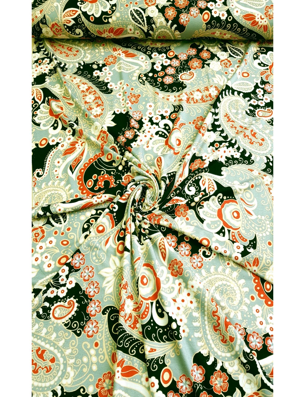 Středně silný viskózový úplet s ikonickým paisley vzorem, příjemný a hladký na dotek, vynikající kvalita, elastický. Vyrobeno v Itálii.