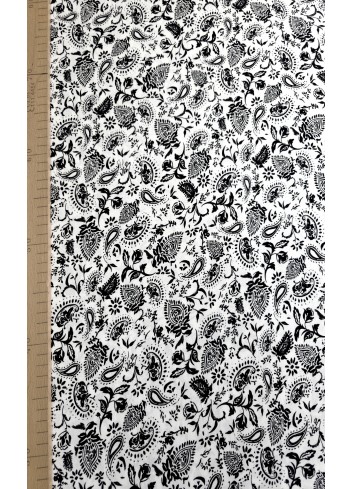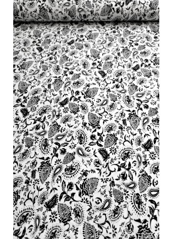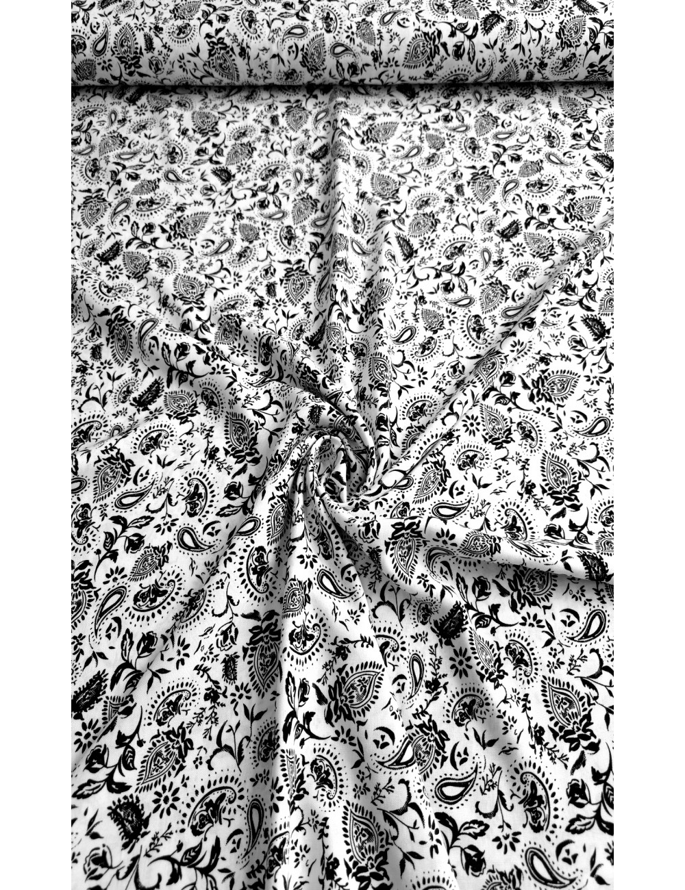 Viskózová látka ve zpracování challis, která je velice splývavá a měkká, příjemná na těle, rovněž se vyznačuje sníženou krčivostí, proto je vhodná na cesty a dovolenou. Černý vzor paisley a drobné květiny na bílém základu.
