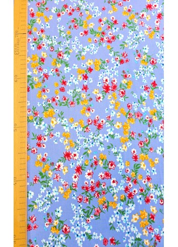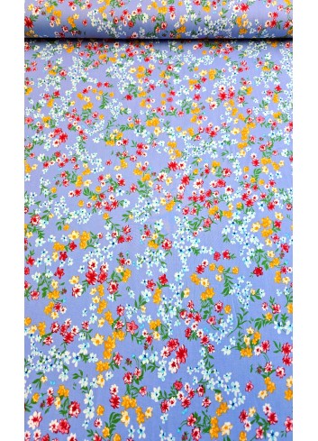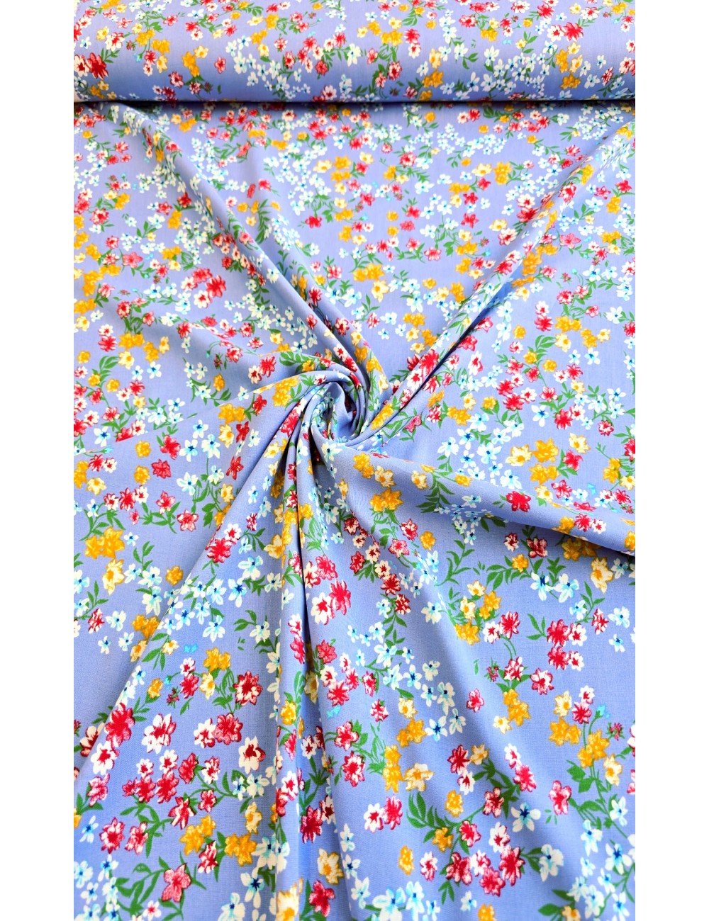 Viskózová látka ve zpracování challis, která je velice splývavá a měkká, příjemná na těle, rovněž se vyznačuje sníženou krčivostí, proto je vhodná na cesty a dovolenou. Barevná květinová louka na světle modrém základu.