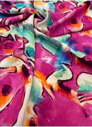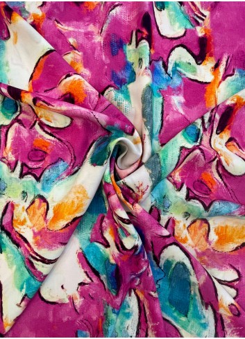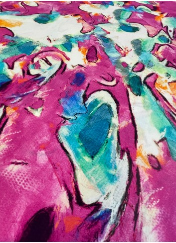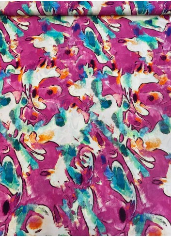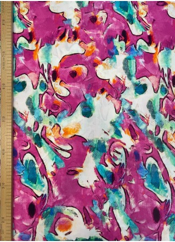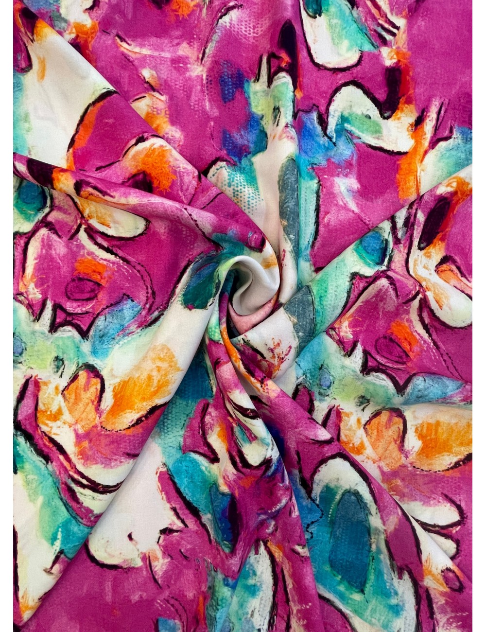 Viskózová látka s abstraktním fuchsiovo-tyrkysovým vzorem , příjemná na dotek , vzdušná, mírně elastická a velmi splývavá.