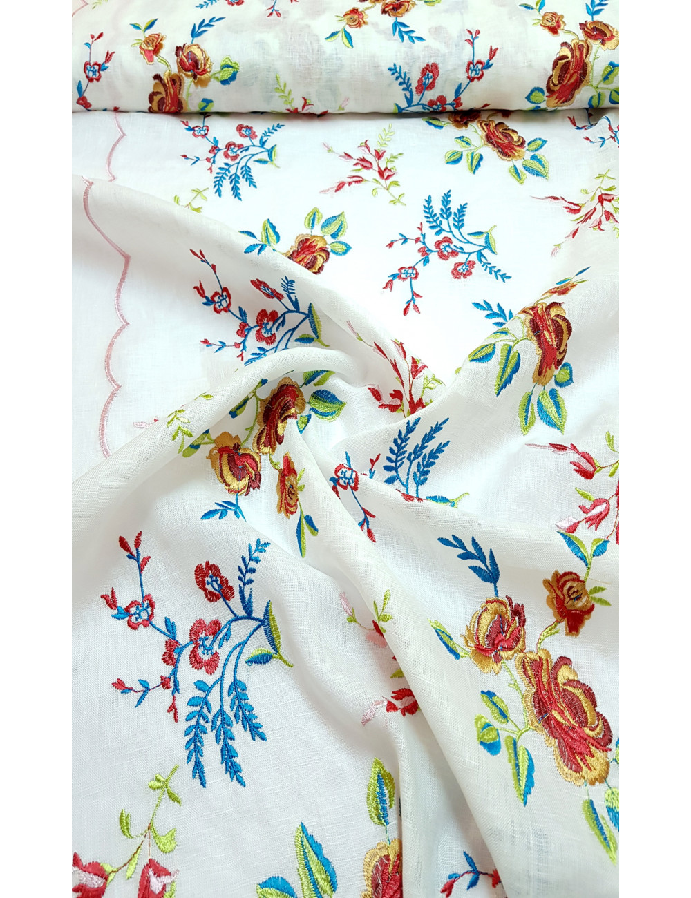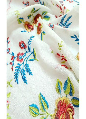 Lněné vlákno má neskutečně příjemné chladivé a osvěžující vlastnosti, což oceníte zejména v horkém počasí. Lněné výrobky dobře snášejí klasické praní v pračce, mají ale tendenci se srážet (o 3-7 %) , proto doporučujeme před šitím materiál vysrážet. Tento len z Itálie je velice příjemný, střední gramáže, vzdušný se sníženou krčivostí. Len v barvě ivory bohatě vyšívaný výšivkou, jaká se běžně vyskytuje jen na krajkách. Made in Italy.
