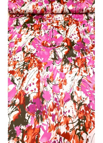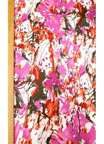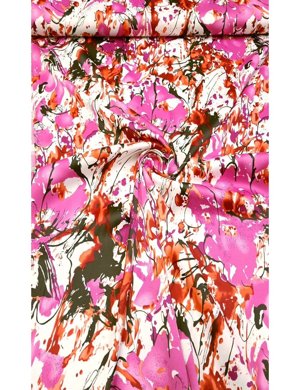 Satén větší gramáže s abstraktním vzorem ve fuchsiových odstínech, příjemný, splývavý, elastický, vynikající poměr ceny a kvality.