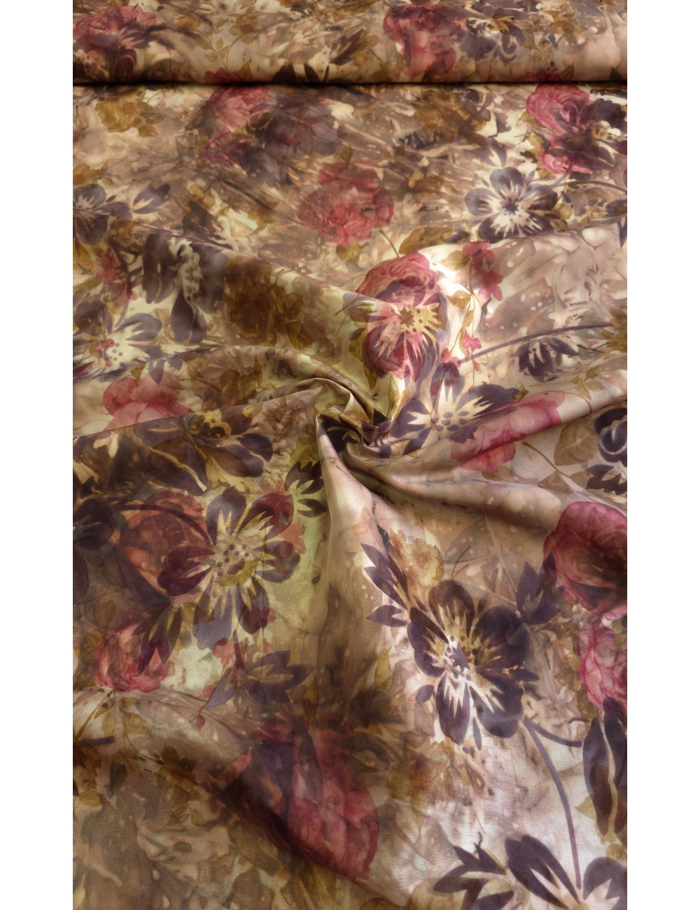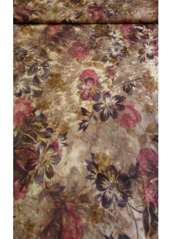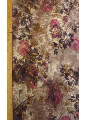 Taft střední gramáže s florálním vzorem v hnědých odstínech, pevnější s mírným leskem, velice kvalitní.