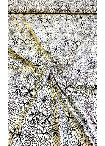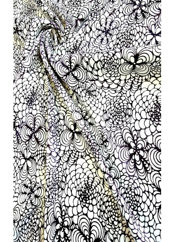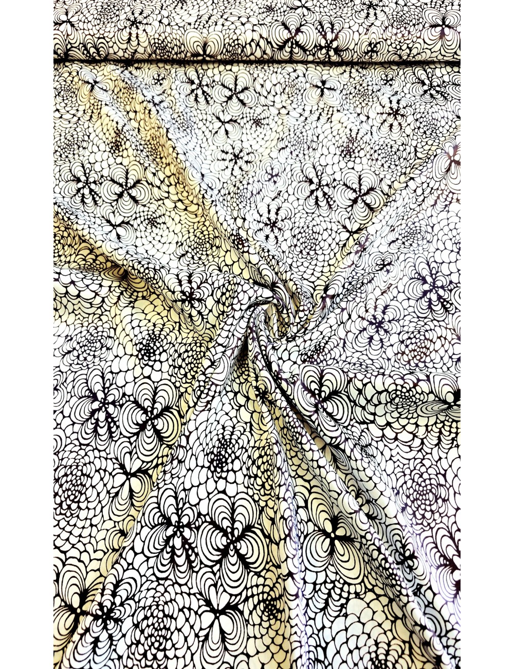 Satén s abstraktním vzorem v hnědé barvě na ivory základu, lehounký, příjemný na nošení, splývavý, elastický s originálním vzorem..