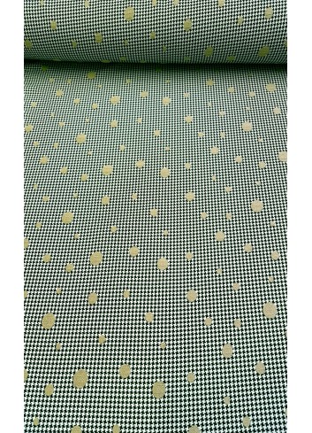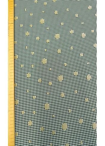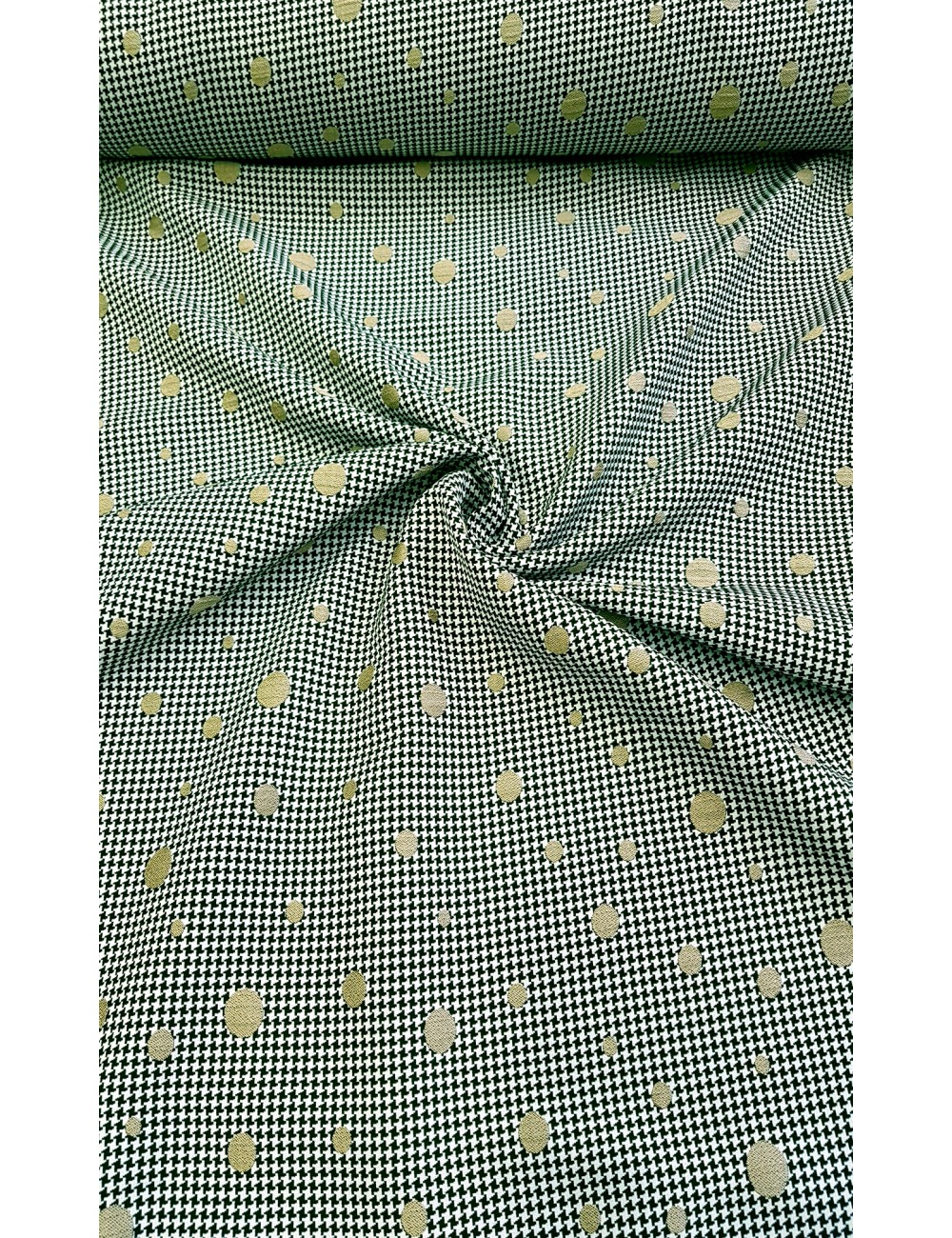 Žakár střední gramáže s drobným vzorem kohoutí stopy v černobílém provedení decentně zdobený zlatým puntíkovaným vzorem. Poddajný, mírně elastický, efektní vzor.