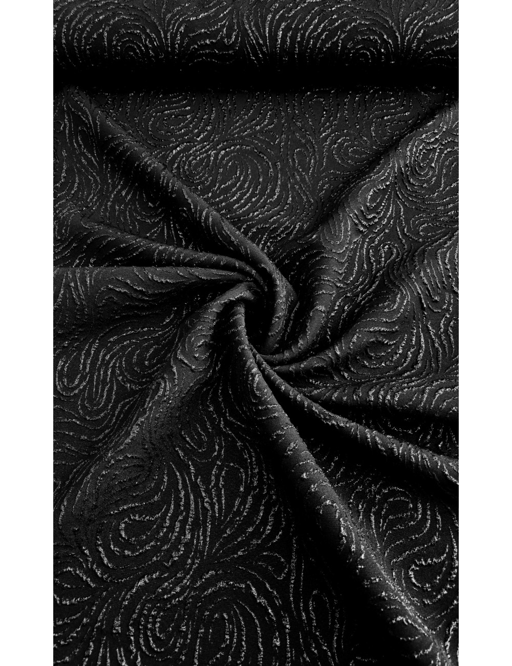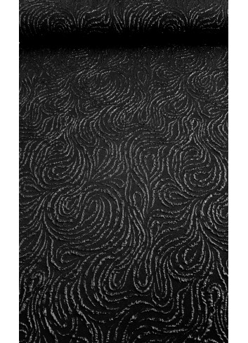 Italský luxusní žakár v černé barvě s vystouplým abstraktním lamé vzorem decentně protkávaným stříbrným lurexovým vláknem, měkký příjemný materiál, nesmírně elegantní. Vyrobeno v Itálii.