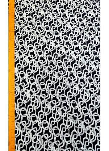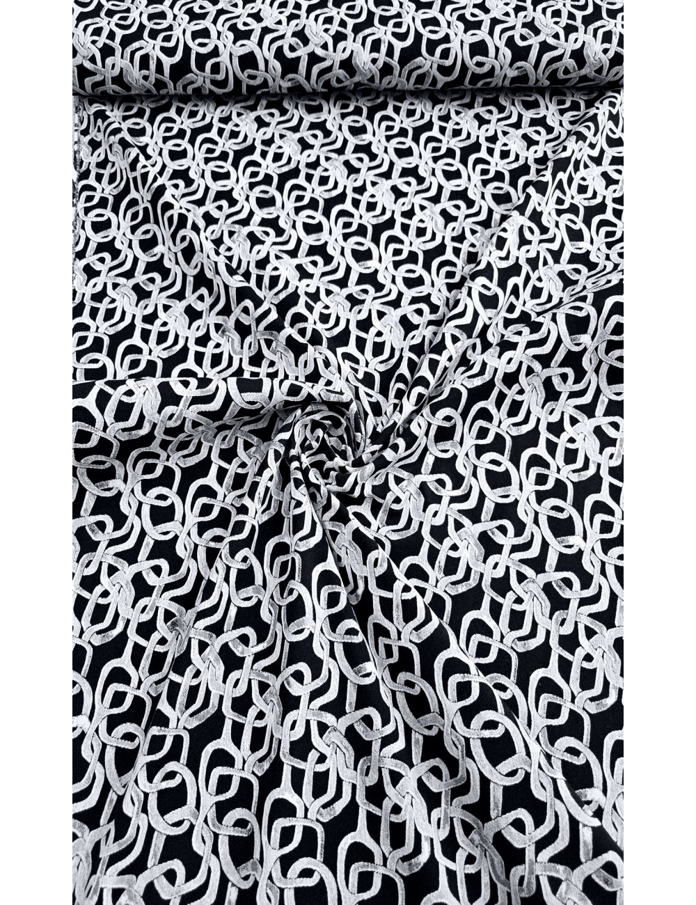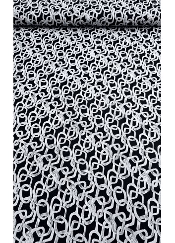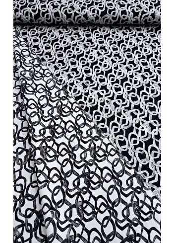 Italský žakár střední gramáže s černobílým geometrickým vzorem, převážně z přírodního materiálu, možno využít oboustranně. Velice příjemný na dotek, mírně elastický, poddajný. Vyrobeno v Itálii, top kvalita.