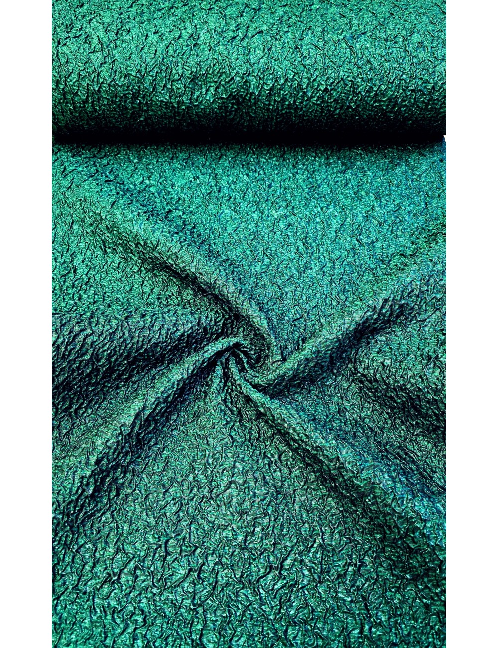 Italský žakár střední gramáže s lesklým mačkaným vzhledem v zeleném provedení, příjemný na dotek, lehoučký, elastický, měkký a splývavý, elegantní a mladistvý.