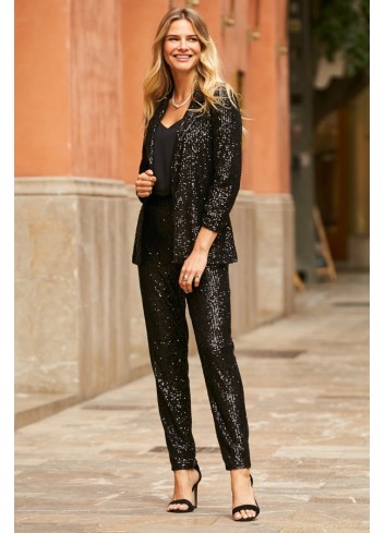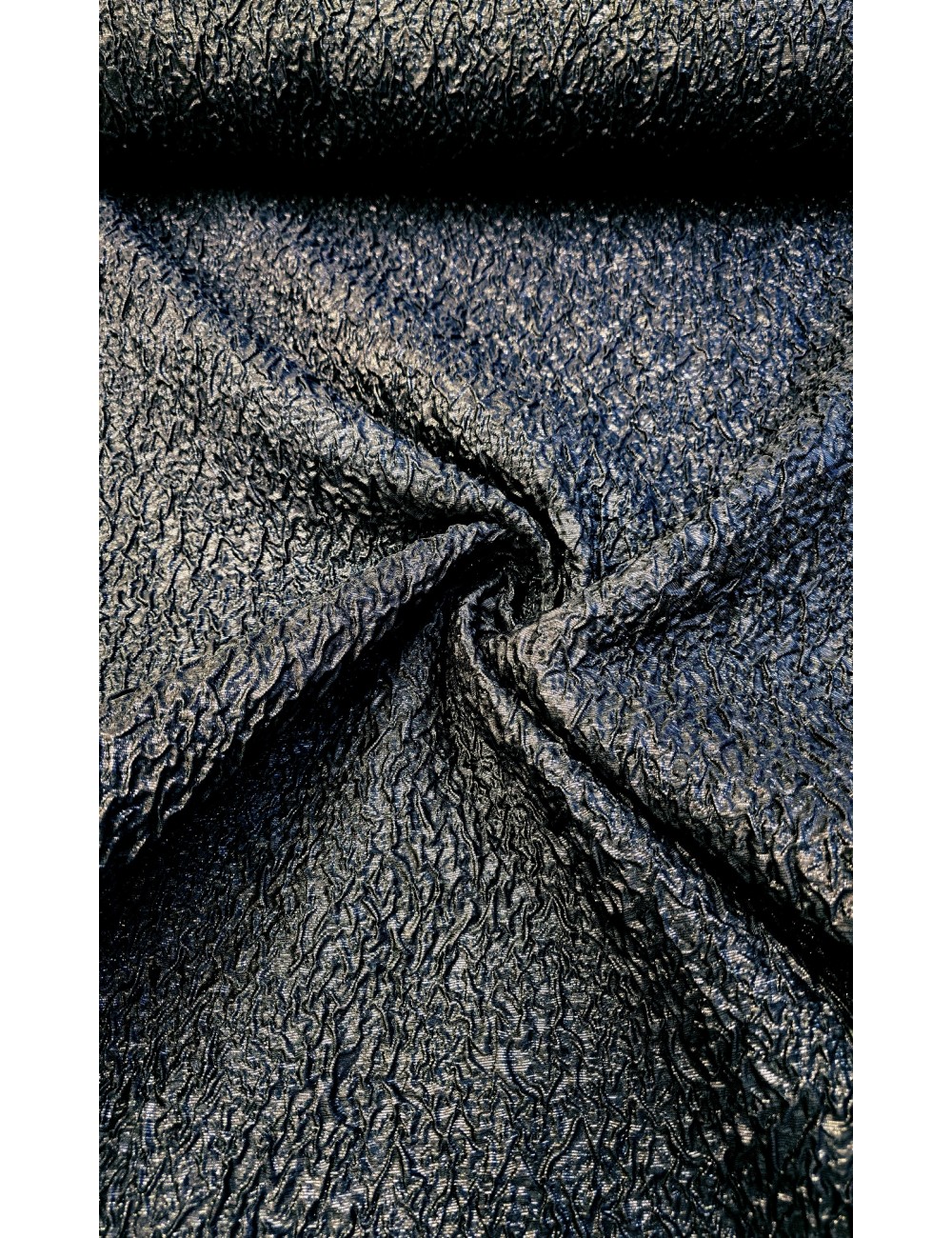 Italský žakár střední gramáže s lesklým mačkaným vzhledem v černém provedení, příjemný na dotek, lehoučký, elastický, měkký a splývavý, elegantní a mladistvý.