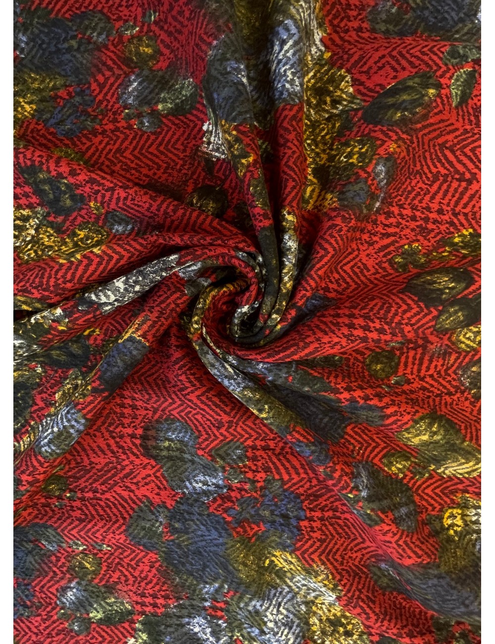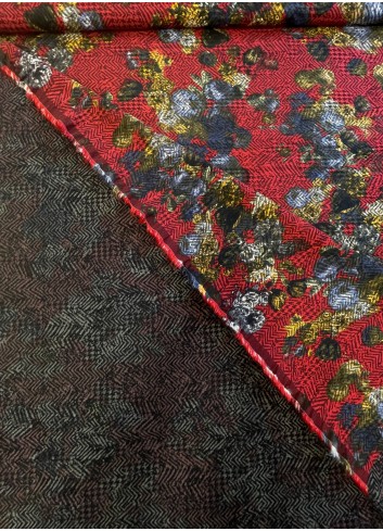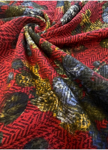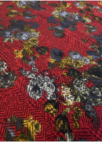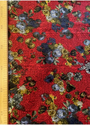 Žakár s květinovým  vzorem na červeném základě . Decentní florální vzhled, střední gramáže, příjemná na dotek, měkký a poddajný. Žakár nepruží na šířku ( po útku) ale po délce (po osnově) . Materiál lze využít oboustranně.
